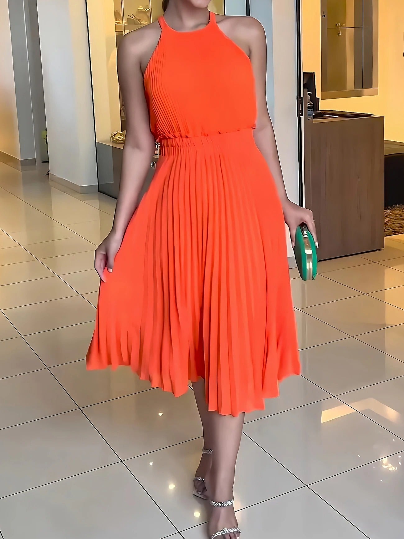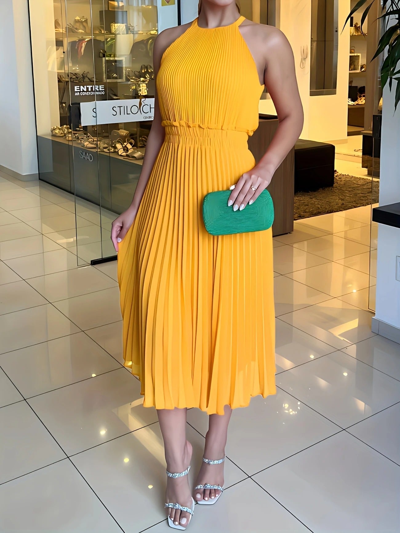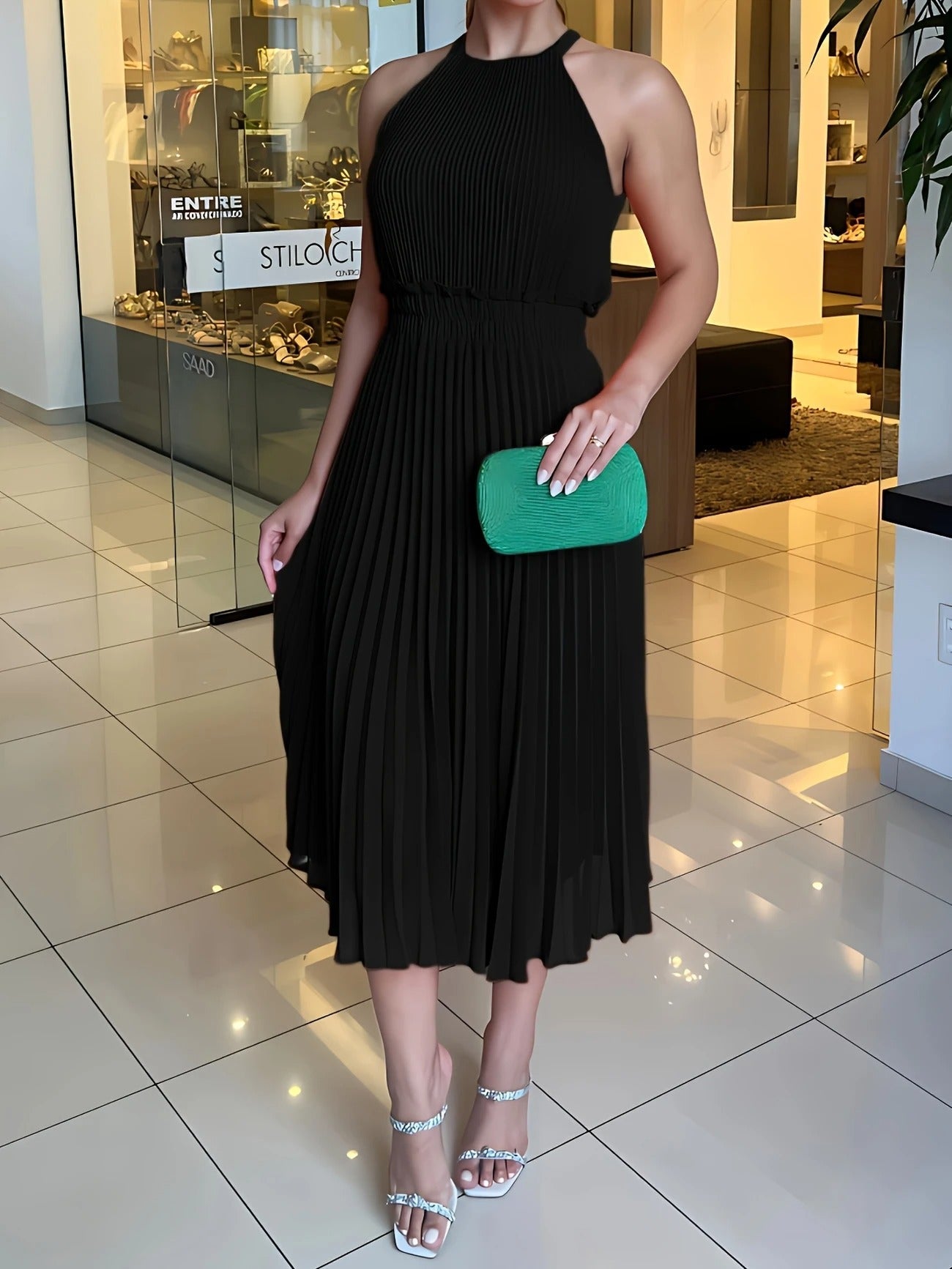 Das Claire Midikleid begeistert mit seinen feinen Plisseefalten, einem hochgeschlossenen, ärmellosen Schnitt und einer luftigen Silhouette, die bei jeder Bewegung anmutig mitschwingt. Der elastische Taillenbund sorgt für eine schöne Form, während die knie- bis wadenlange Länge es zu einem stilvollen Begleiter für verschiedenste Anlässe macht – ob festlich, entspannt oder im Alltag.