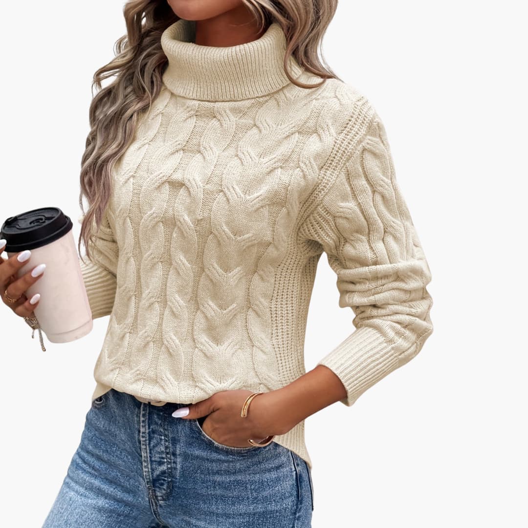 Zopfmuster-Rollkragenpullover für Damen mit gerippten Bündchen und Saum.
